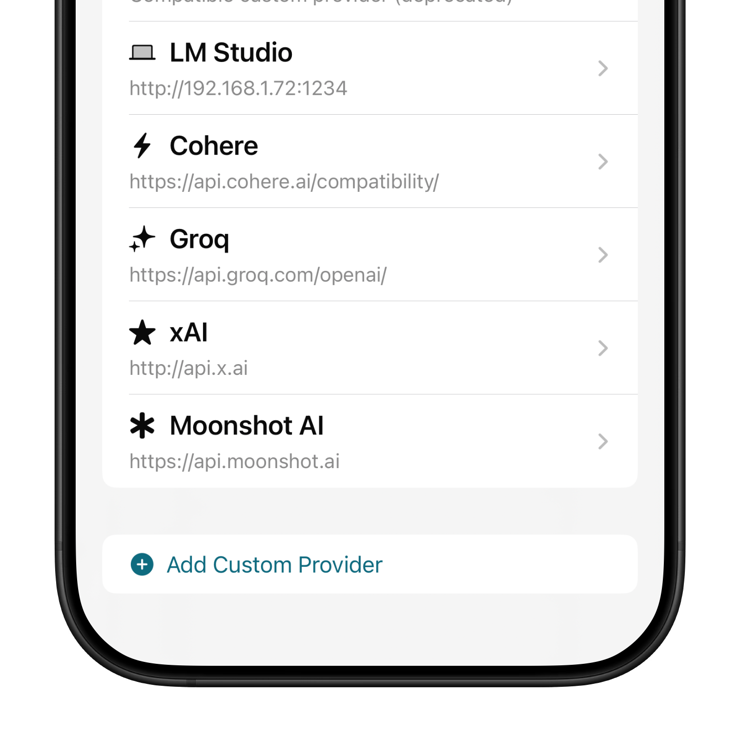 Custom providers must support OpenAI compatible Chat Completions endpoints. Most of LLM providers do, including xAI (Grok), Groq, DeepSeek, MS Azure, Mistral, Cohere, Perplexity, Moonshot AI, TogetherAI and many others.