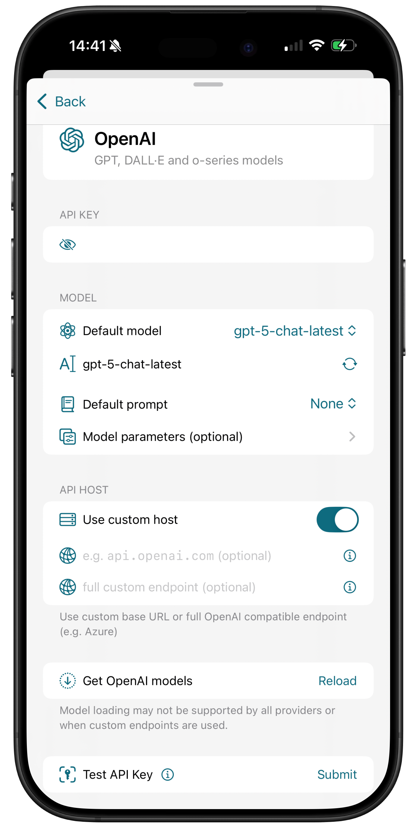 Settings > Configuration (macOS) or Settings > API Settings (iOS)Use custom host switchhttps://api.x.ai in the field. Below the fields you will see your endpoint preview that should look like https://api.x.ai/v1/chat/completionsgrok-3Some providers like Azure offer OpenAI compatible endpoints that are slightly different from OpenAI SDK, but many features are still supported.